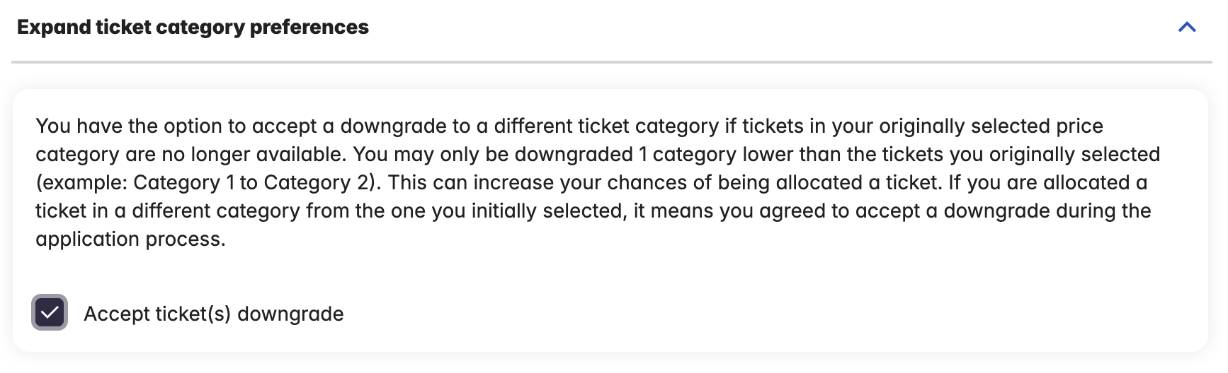 - メリット: チェックを入れると、希望カテゴリーが売り切れでも、下位カテゴリーに空きがあれば当選できるため、チケット入手の確率は上がります 。
