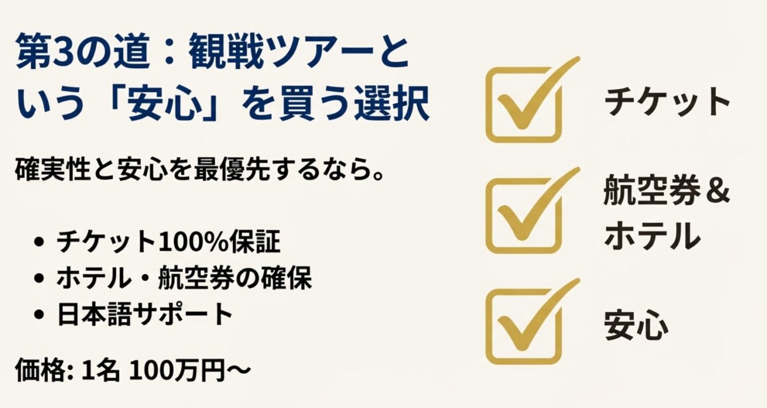 あなたがこの記事を読み終える頃には、漠然とした不安が消え、「自分はどのルートで、いくらの予算をかけてチケットを確保すべきか」という明確な戦略が描けるようになっているはずです。