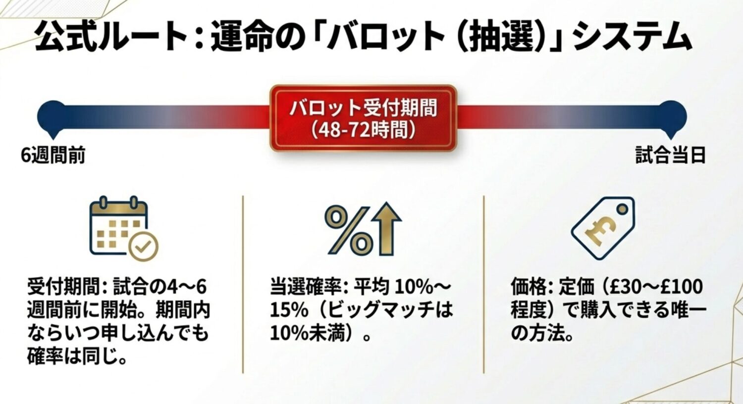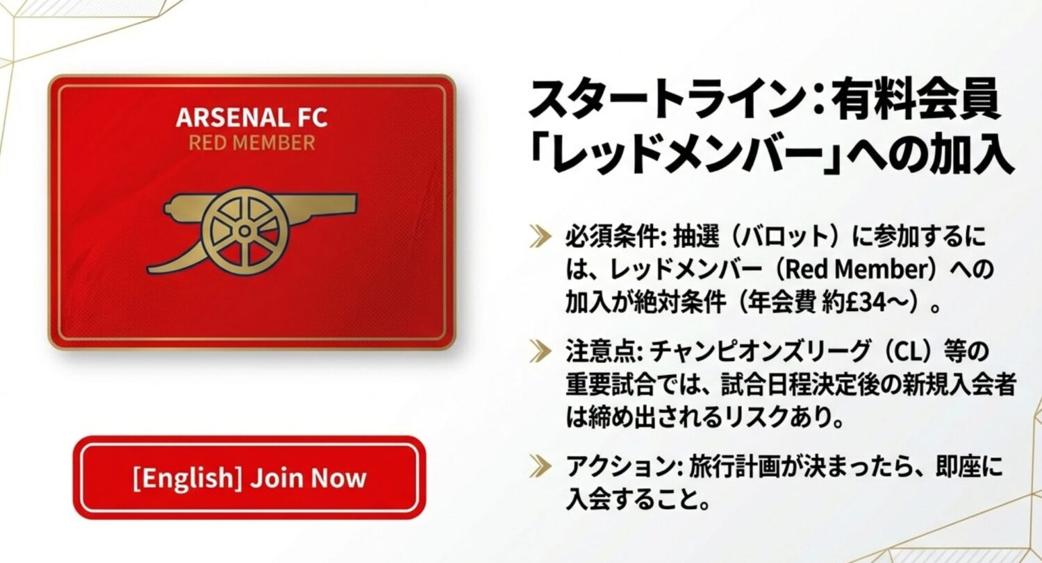 | Red Member (レッドメンバー) | 18歳以上の大人 | £34〜£39 | 【日本在住者の99%がここ】 各試合ごとの抽選(バロット)参加権と、落選後のリセールアクセス権が付与されます。 |
