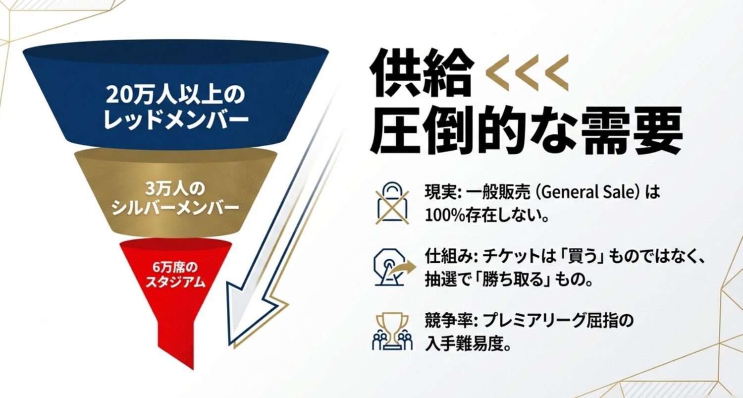 「会員にならずに一般販売(General Sale)で買えないの?」という疑問を持つ方もいるかもしれませんが、結論から申し上げますと、プレミアリーグのホームゲームで一般販売が行われることは、現代においてはほぼ100%あり得ません。