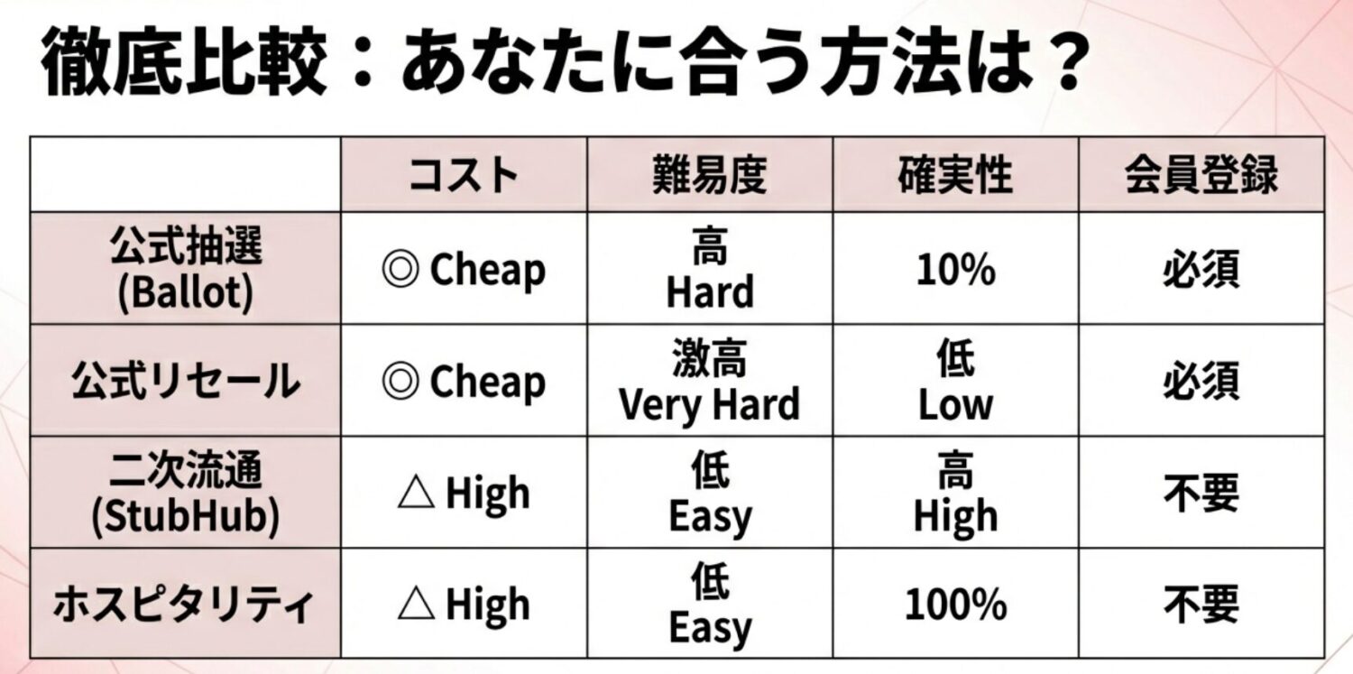 これは、ボットによる秒速での買い占め対策と、販売時間にアクセスできない海外ファンへの公平性担保が目的ですが、結果としてチケット入手は「実力」から「運」のゲームへと変貌しました。