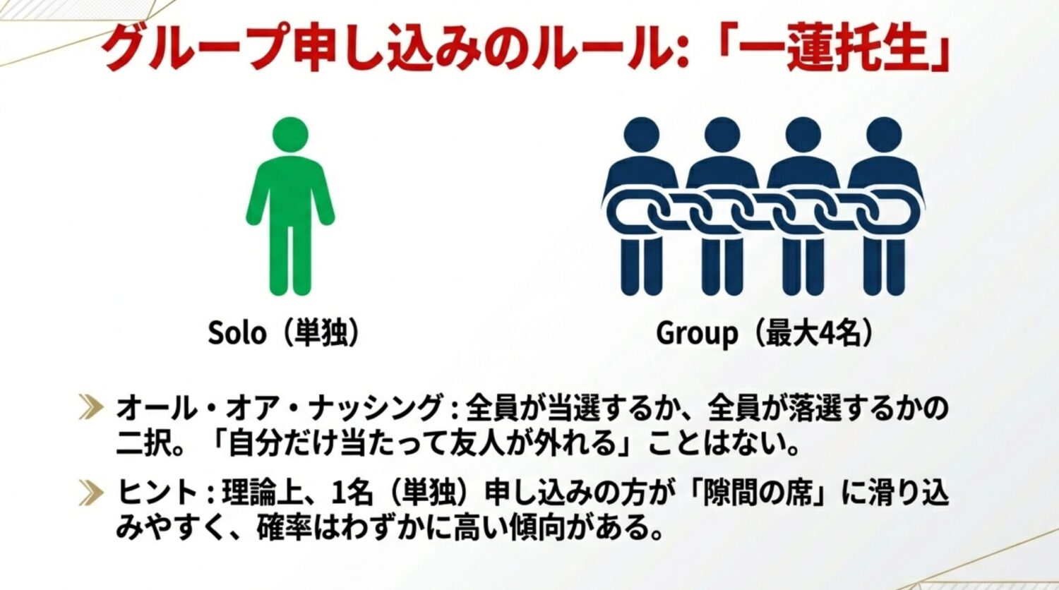 これにより「自分だけ当たって友人が外れた」という悲劇は回避できますが、グループサイズが大きくなるほど、並び席の確保が難しくなり、理論上の当選確率に影響を与える可能性があります(公式には明言されていませんが、単独申し込みの方が隙間の席に滑り込みやすい傾向があります)。