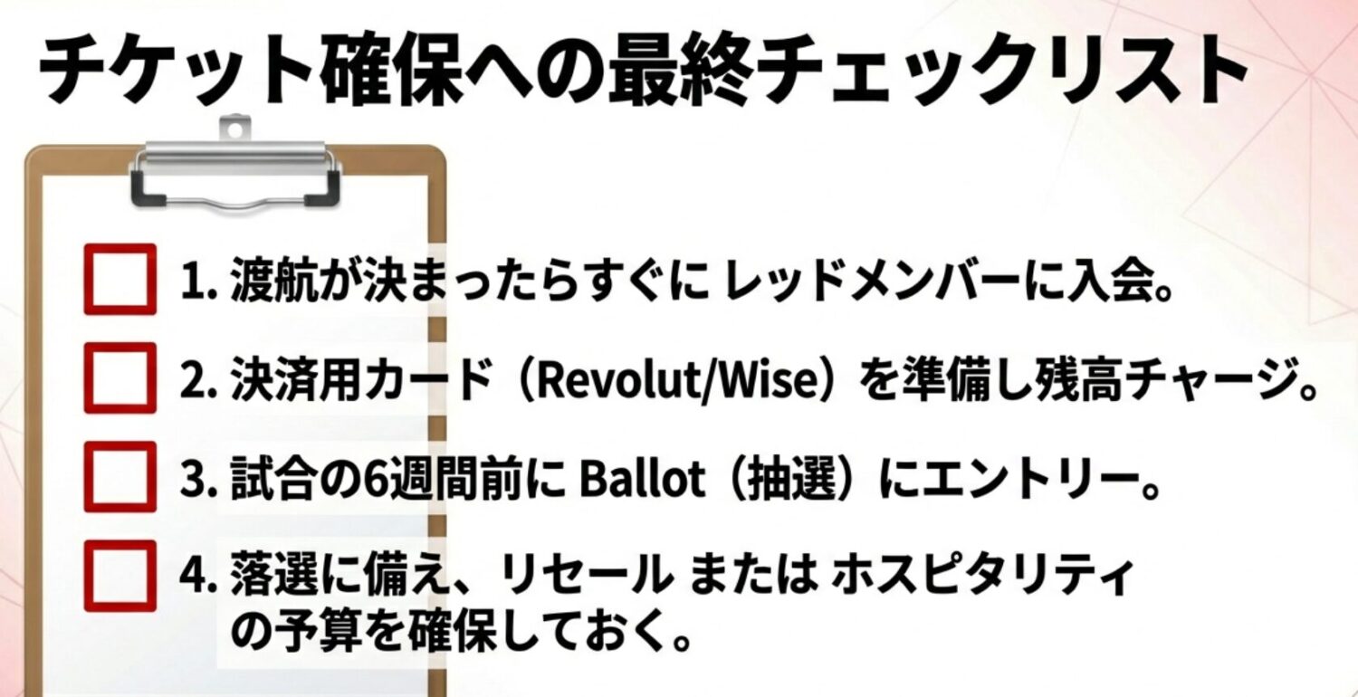 結論: この制度は、長年にわたりチームと共に遠征してきた熱心なサポーターに報いるための、事実上のクローズドなシステムです。そのため、新規メンバーがこのシステムに割って入ることは現実的ではありません。まずはホームゲームのチケット確保に全力を注ぐことを強く推奨します。