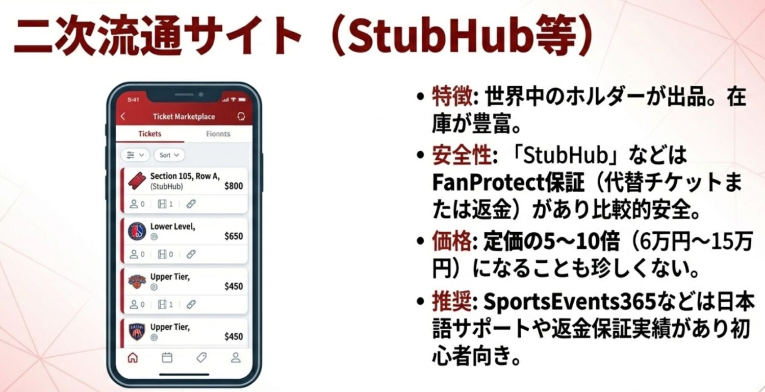 - 万全の保証制度: 購入したチケットに問題があった場合(無効、入場不可など)、StubHubが同等以上の代替チケットを用意するか、それが不可能な場合は購入代金を全額返金します。