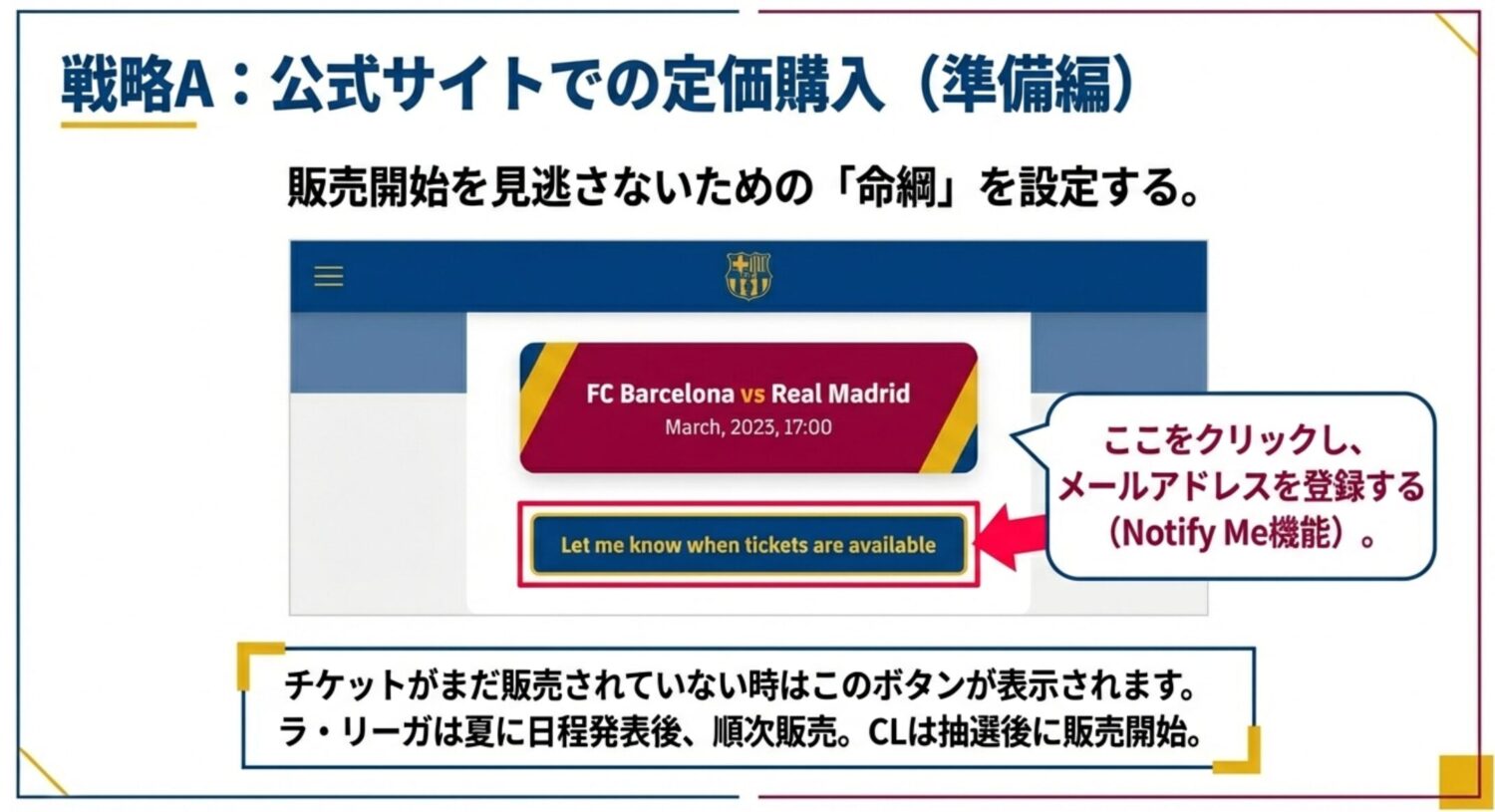 - ノックアウトステージ: 各ラウンド(ベスト16、準々決勝など)の抽選は、前のラウンドが終了した後に行われます。対戦相手とホーム&アウェイの日程が確定するとほぼ同時にチケットが発売されますが、この販売期間は非常に短い場合があります 。ここではソシオ会員が持つ24時間の優先購入権が決定的なアドバンテージとなります 。