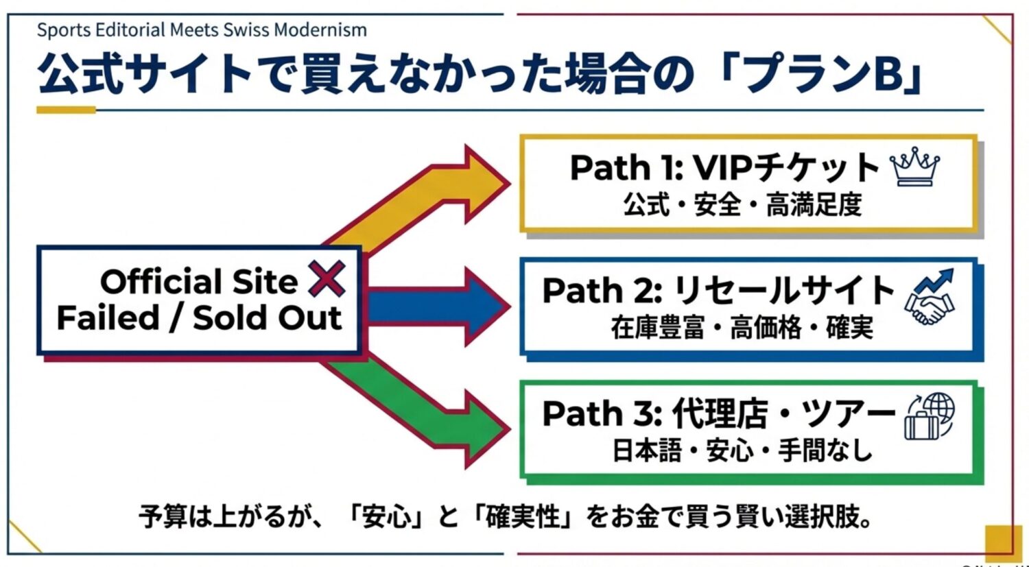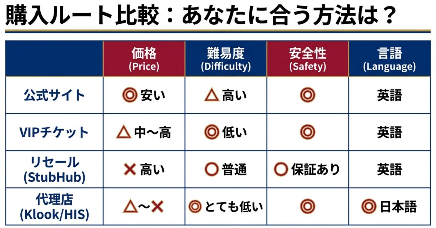 一般席がダメでも、公式のVIP席が残っていないか確認しましょう。転売価格と変わらない値段で、極上の体験ができます。 - 最終手段としてStubHubやSportsEvents365(確実性):