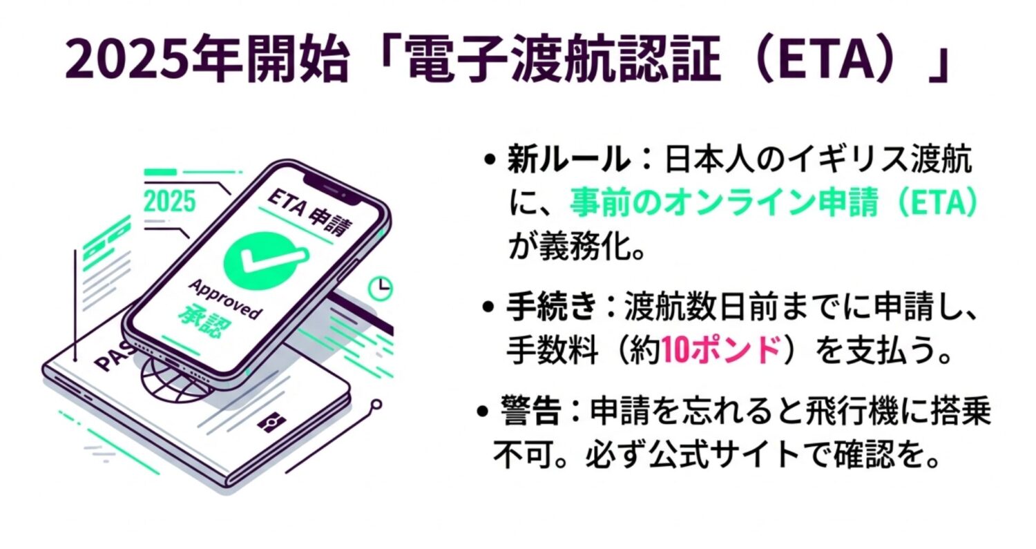 特に重要なのが、2025年から導入された新しい入国制度です。これまで日本人はビザなしでイギリスに行けましたが、現在は「電子渡航認証(ETA)」の事前申請が義務付けられています。
