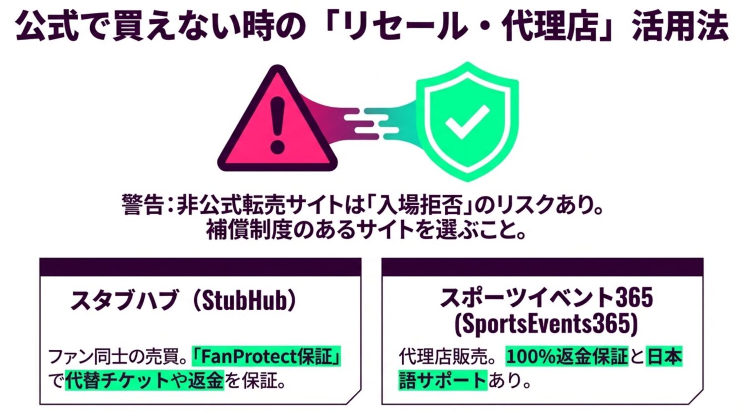 公式が運営する「Ticket Exchange(チケットエクスチェンジ)」などの正規リセールであれば全く問題ありませんが、非公式の転売サイトで購入したチケットは、最悪の場合、スタジアムの入場ゲートで無効化されて入場拒否されるリスクがあります。