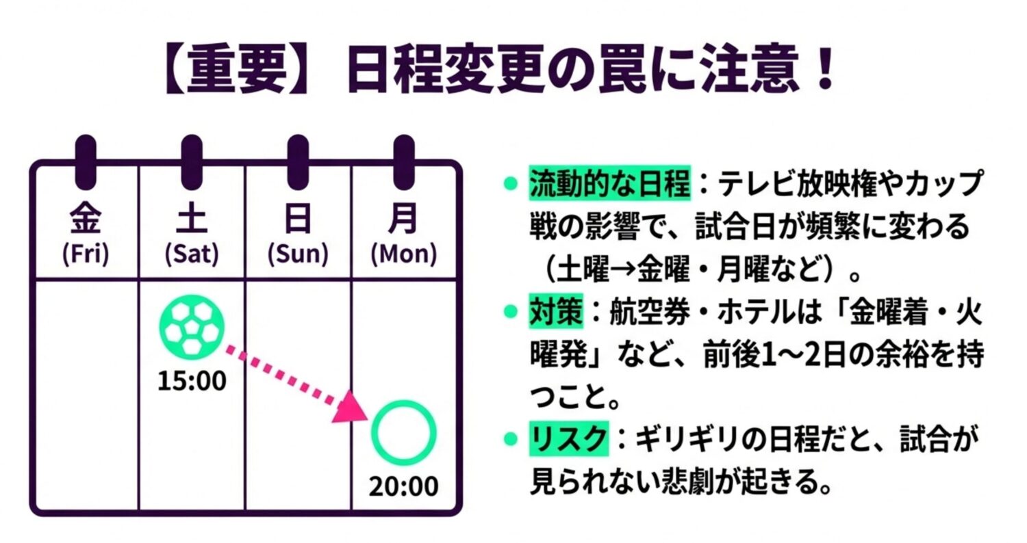 ギリギリの日程で組むと、試合が見られないという悲劇が起こりかねません。