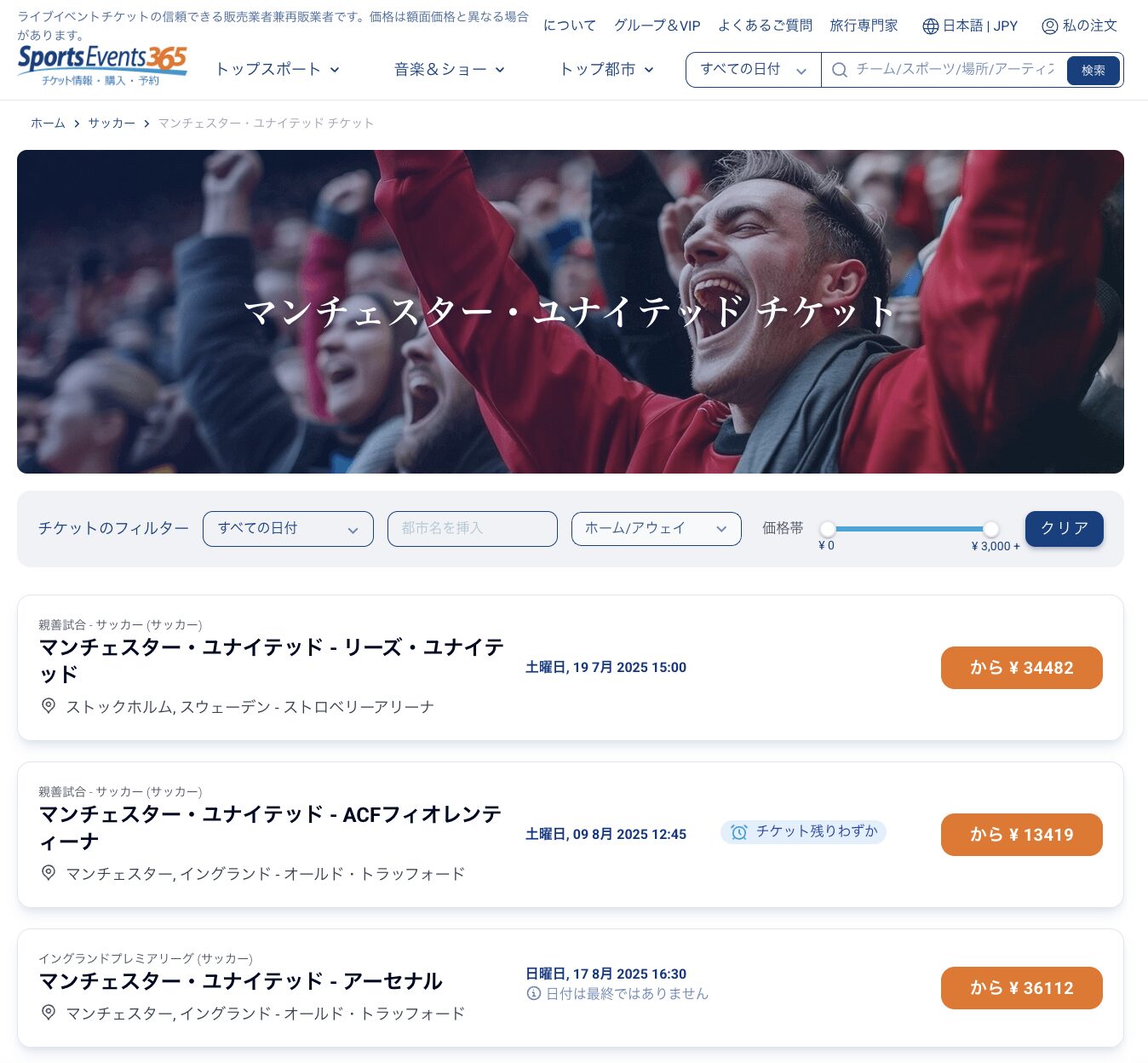 公式サイトでチケットが完売している場合や、どうしても観戦したいビッグマッチがある場合は、SportsEvents365などのリセールサイトが便利です。少し割高になることもありますが、急な予定変更にも対応しやすい点や、豊富な選択肢が魅力です。