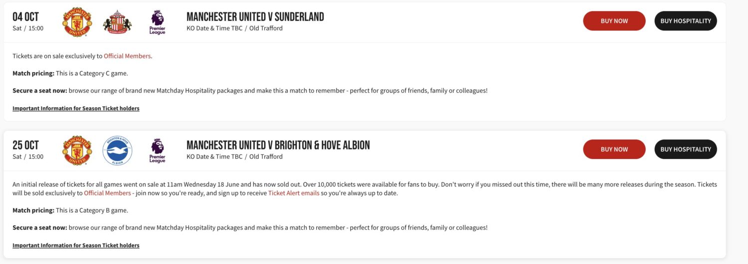 公式サイトからのプレミアリーグホームゲームのチケット販売は大きく分けて3種類に分類されます。