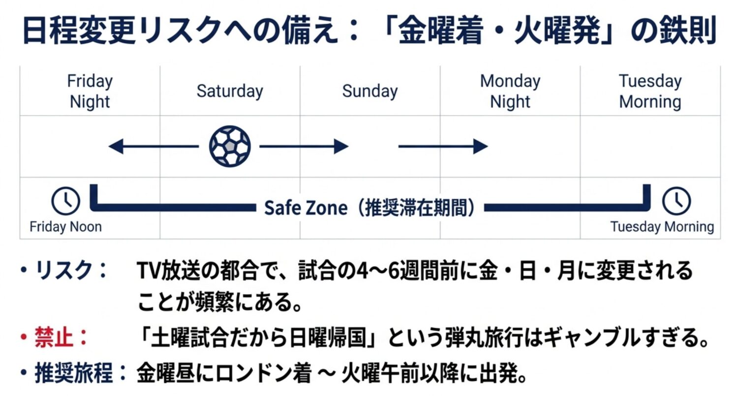 ロンドンへの観戦旅行を計画する際は、必ず「金曜日のお昼にはロンドンに到着し、火曜日の午前中以降に出発する」ようにスケジュールを組んでください。これにより、試合が金曜夜、土曜、日曜、月曜夜のどのタイミングで開催されても対応が可能になります。「土曜開催だから日曜帰国でいいや」という弾丸旅行は、ギャンブル要素が高すぎるため絶対に避けるべきです。