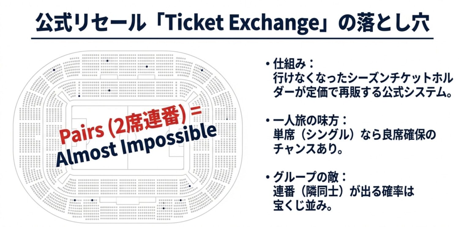 「売り切れでもまだチャンスがある!」と思える素晴らしいシステムですが、日本からの旅行者、特に「2人以上」で観戦する場合には大きな落とし穴があります。