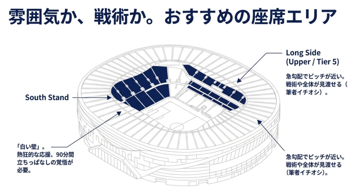 | Long Side (ロングサイド) | ピッチ全体を横から見渡せるメイン・バックスタンド。特に上層階(Tier 5)は最大35度という急勾配で、ピッチが驚くほど近く感じる。 | 試合展開をじっくり見たい人 戦術的な動きを楽しみたい人 |