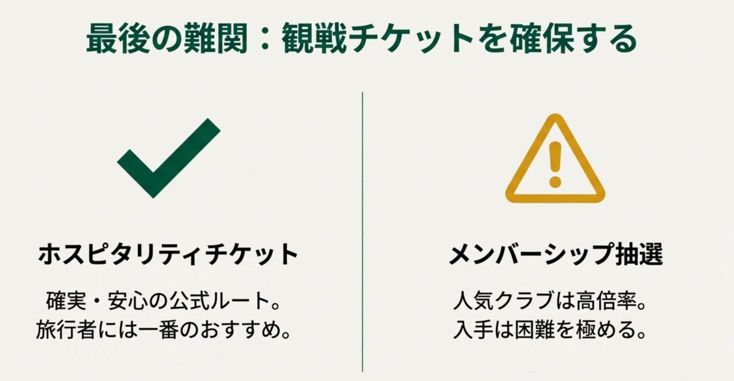 - ホスピタリティチケット:食事付きなどで高額ですが、公式代理店から購入でき、入場が100%保証されるので旅行者には一番安心です。