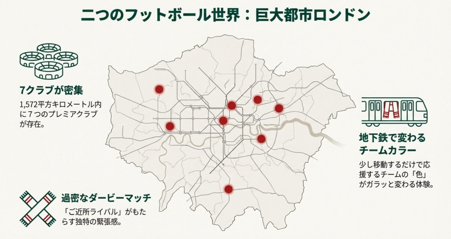 | グレーター・ロンドン | アーセナル、チェルシー、トッテナム、ウェストハム、クリスタル・パレス、フラム、ブレントフォード | 7クラブがひしめく世界最大のフットボール経済圏 |