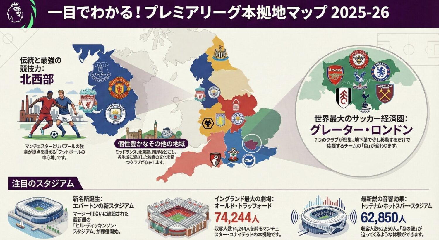 2025-26シーズンのプレミアリーグは、新スタジアムの登場や北部の復権など、地図を通して見るとまた違った面白さが見えてきます。