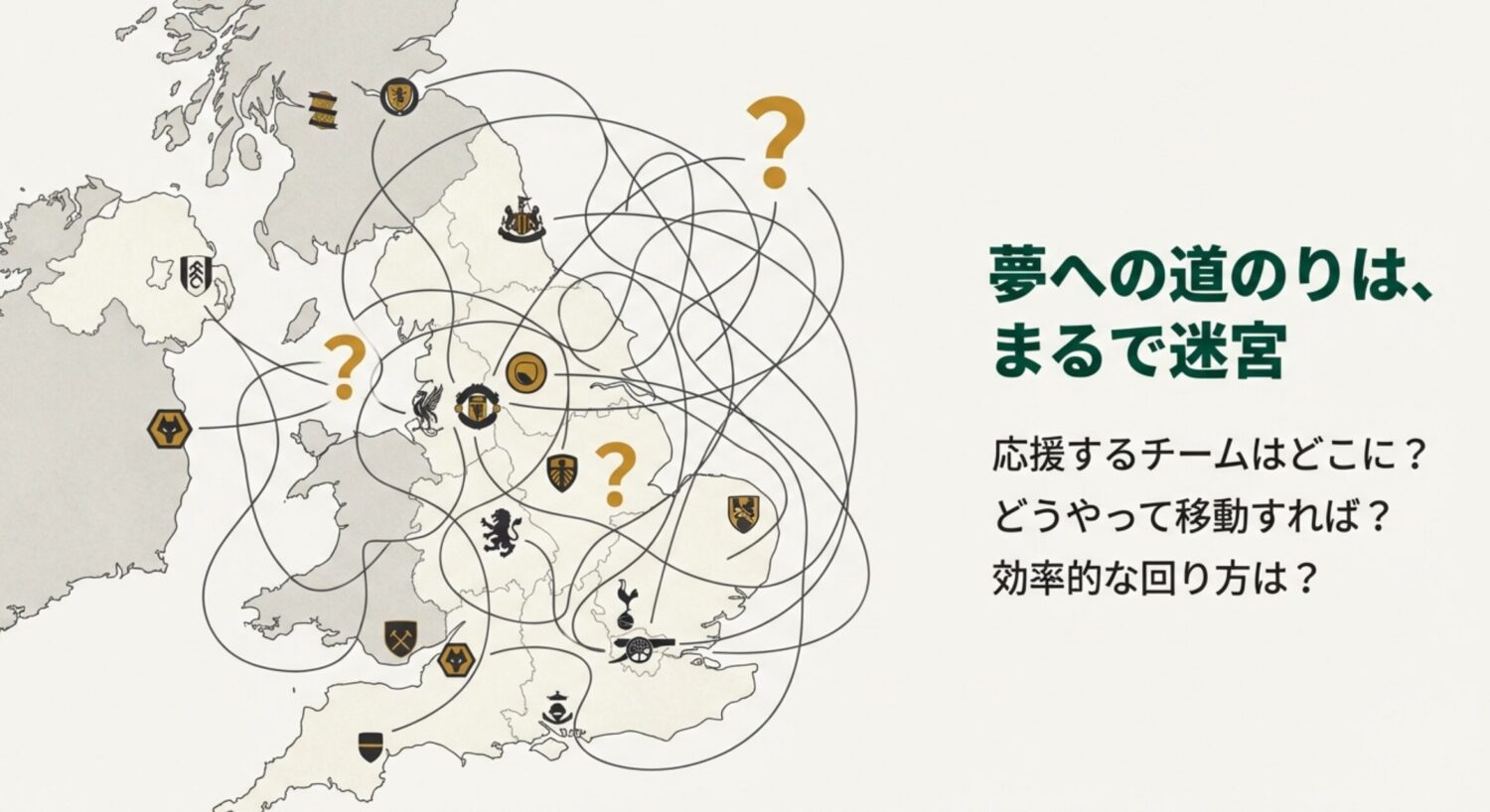 イギリスの地理に詳しくないと、ロンドンにあるスタジアムの位置関係や、マンチェスターやリバプールといった北部の都市へのアクセス方法をイメージするのはなかなか難しいですよね。