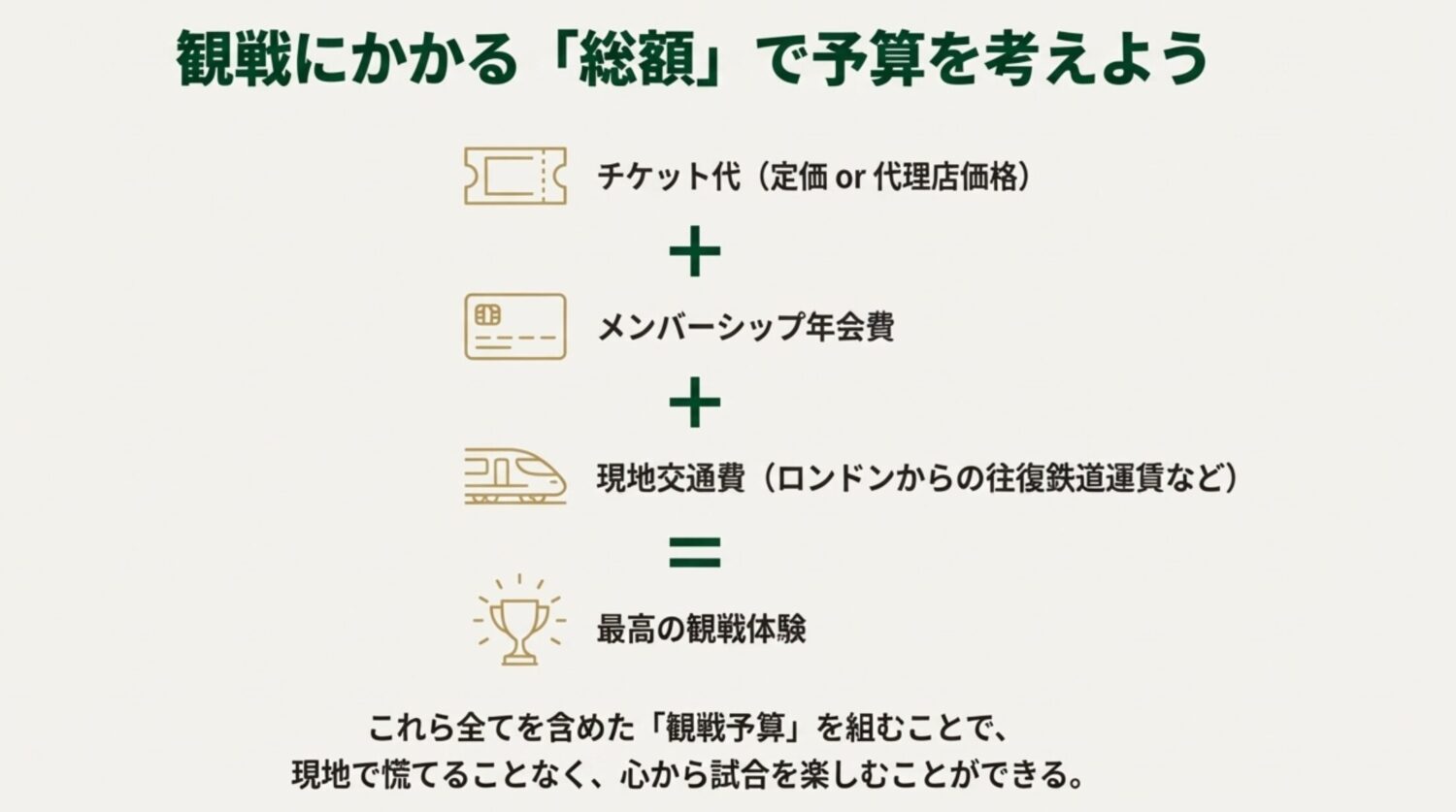 特にアーセナルやリヴァプールのような人気クラブの場合、単純なチケット代だけでなく、メンバーシップへの加入費用や、場合によっては少し高めの代理店手数料など、目に見えにくいコストも考慮する必要があります。