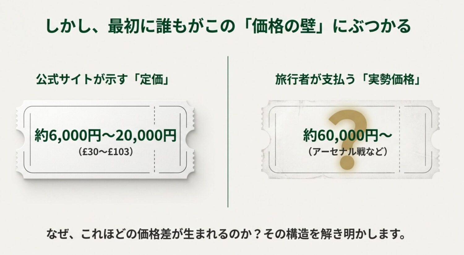 まずは、プレミアリーグのチケットにおける「定価」と、実際に私たちが手に入れるためにかかる「実勢価格」の構造について解説していきます。
