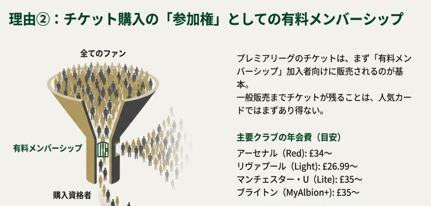 プレミアリーグのほとんどのクラブでは、チケットを購入するために「有料メンバーシップ」への加入が事実上の必須条件となっています。