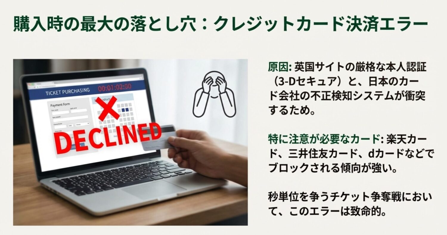 - KlookやTrip.comを利用する: 前述のKlookなどは、アジア圏の決済ゲートウェイを使用しているため、日本のクレジットカードでもほぼ確実に決済できます。マンチェスター・シティなどのチケットなら、ここ経由で買うのが決済ストレスフリーです。