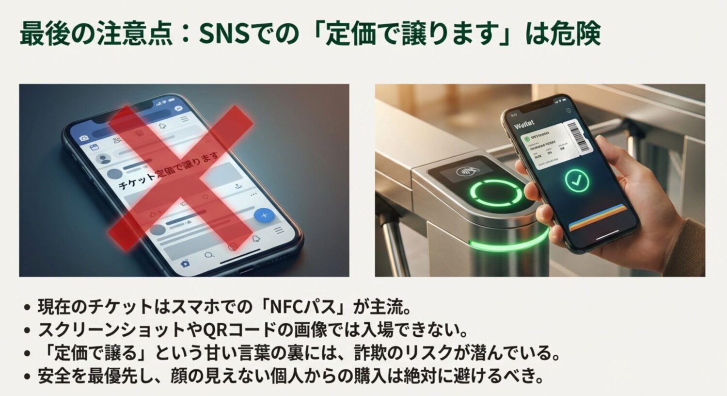 「定価で譲る」という甘い言葉には裏があります。安易にPayPayなどで送金してしまい、チケットが送られてこない、あるいは送られてきても現地で使えない偽物だった、といったトラブルを避けるためにも、顔の見えない個人からの購入は絶対に避けるべきです。