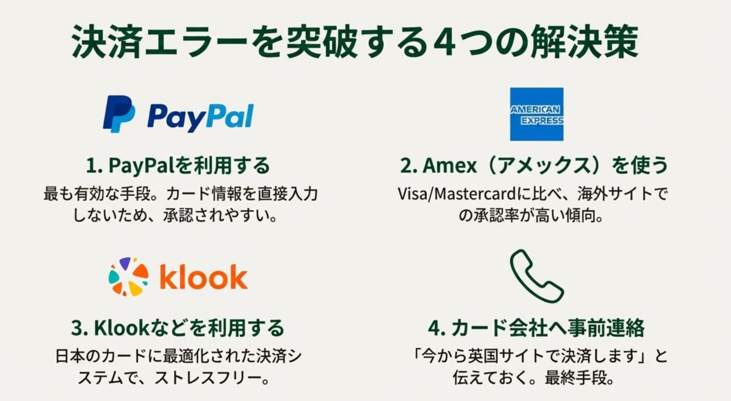 - カード会社への事前連絡: 決済直前にカードデスクに電話し、「今からイギリスのサイトで〇〇円くらいの決済をするのでセキュリティを解除してください」と伝えておく方法です。ただ、最近はWeb完結型のカードも多く、電話が繋がりにくいこともあるので、あくまで予備策として考えてください。