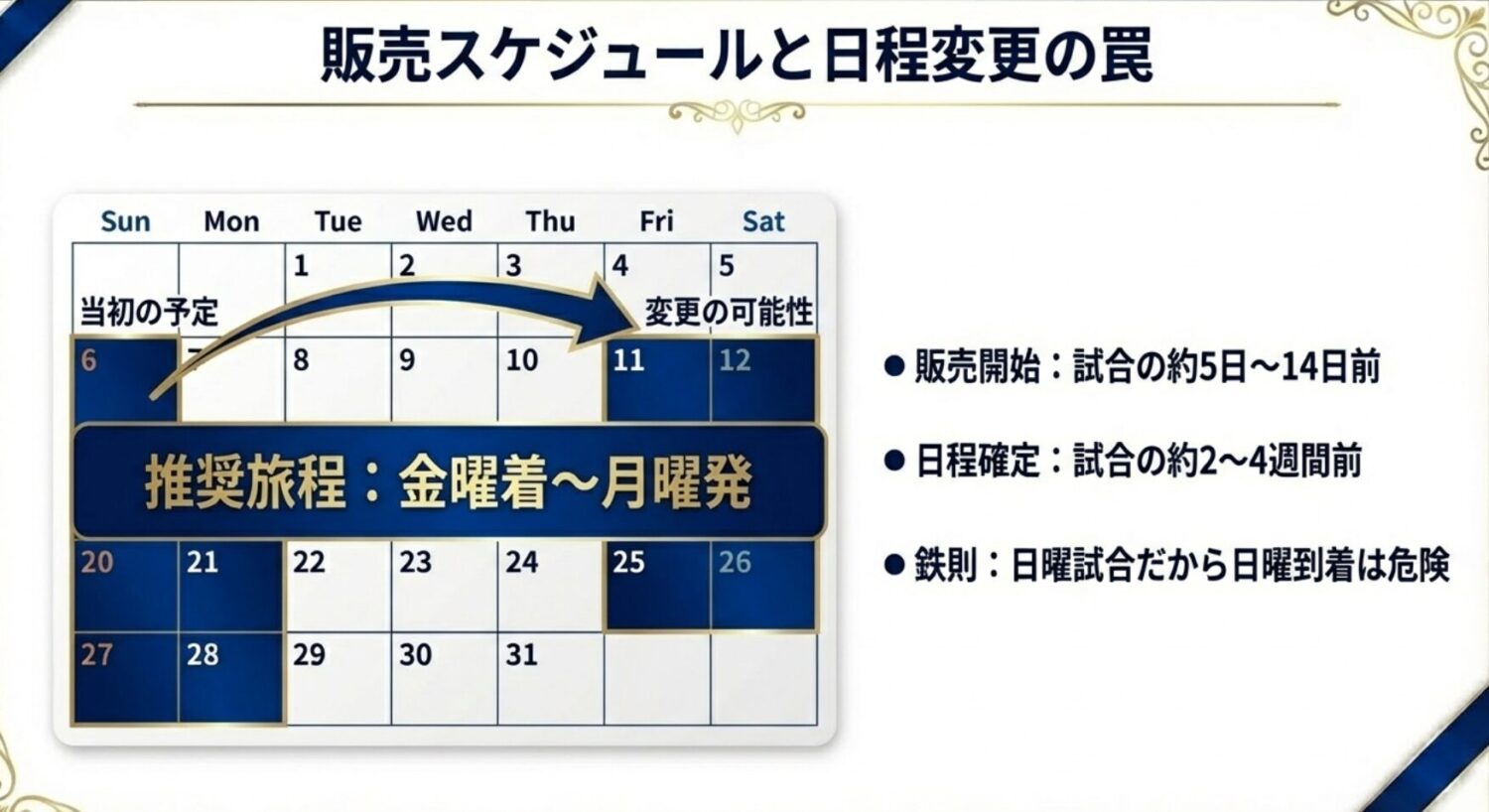 「日曜日の試合だから日曜朝着のフライトで間に合う」という計画は、土曜開催に変更された瞬間に破綻します。航空券やホテルを手配する際は、金曜日の到着から月曜日の出発まで、週末全体をカバーできる余裕を持ったスケジュールを組むことが、現地観戦を成功させるための鉄則です。